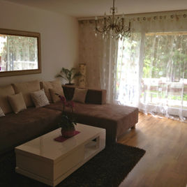 Large living room with sofa bed, fireplace, and dining room. Access to a covered terrace with garden including furniture, deckchairs and barbecue to spend moments of conviviality with the two other flatmates.